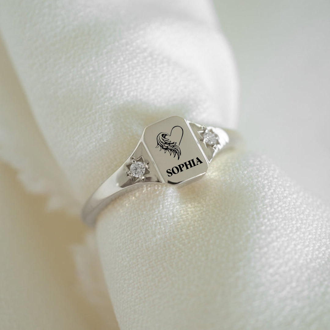 Delicately sculpted wings embrace a heart, symbolizing your daughter’s boundless spirit and the protective love that surrounds her. Whether she’s your little angel here on Earth or watching over you from above, the intricate wing motif and engraved name serve as a daily reminder of the joy and pride she brings to your life.