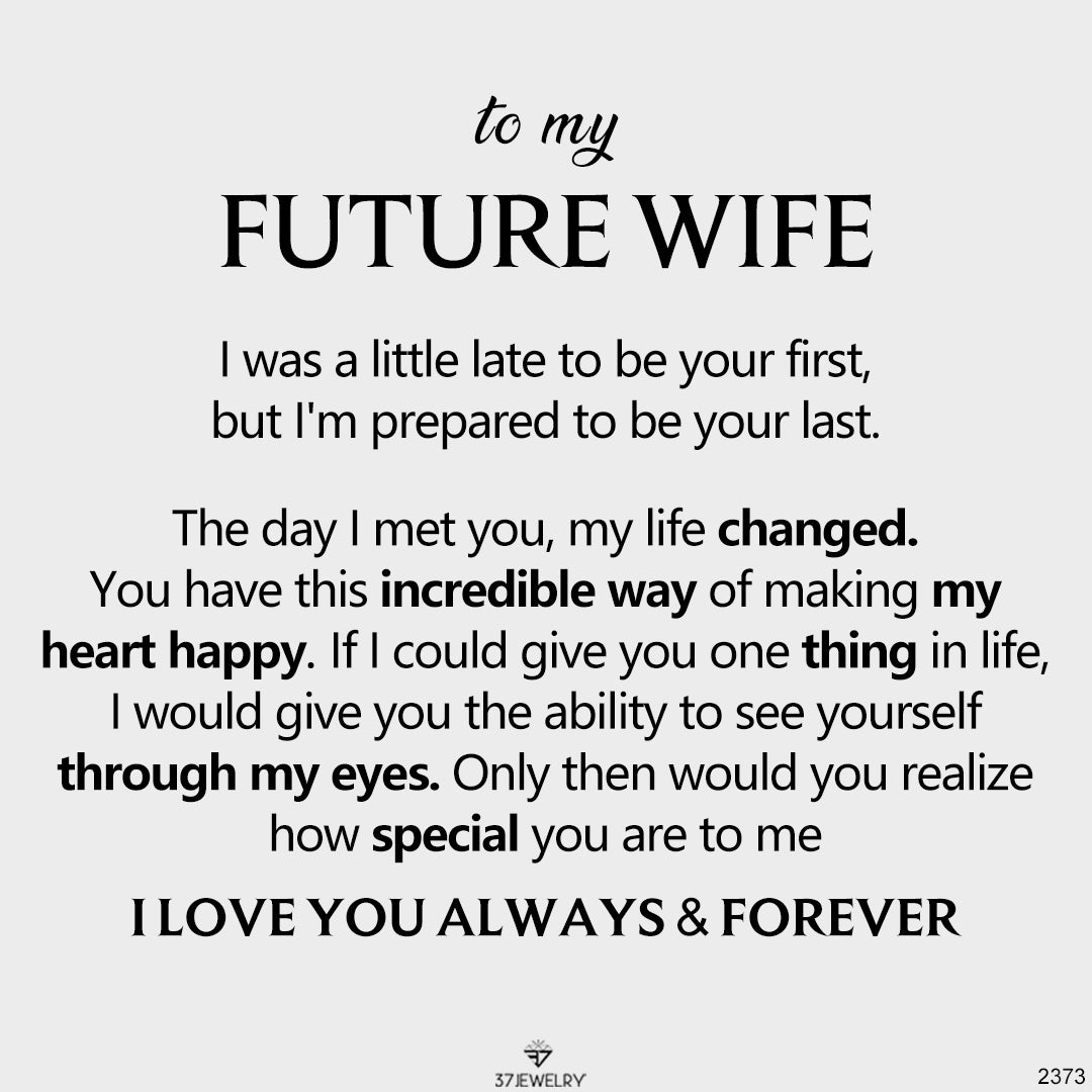"TO MY FUTURE WIFE - I was a little late to be your first, but I'm prepared to be your last. The day I met you, my life changed. You have this incredible way of making my heart happy. If I could give you one thing in life, I would give you the ability to see yourself through my eyes. Only then would you realize how special you are to me. I LOVE YOU ALWAYS & FOREVER"
